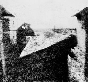 A primeira imagem permanente da história foi criada por Joseph Nicéphore Niépce, um inventor francês. A fotografia, intitulada View from the Window at Le Gras (Vista da Janela em Le Gras), foi captada através de uma técnica chamada heliografia, que utilizava uma placa de estanho revestida com betume da Judeia, uma substância sensível à luz. Niépce expôs esta placa à luz solar durante um longo período — estimado entre oito horas e vários dias —, resultando numa imagem rudimentar das vistas observadas a partir da janela do seu estúdio. Este prolongado tempo de exposição era necessário devido à reduzida sensibilidade dos materiais disponíveis na época, muito menos eficazes do que as tecnologias de captação atuais.